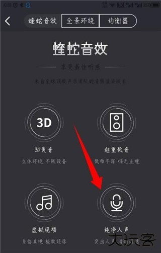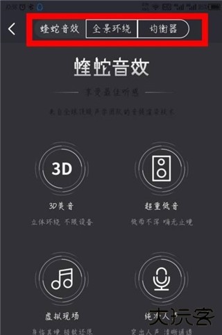 4、然后能看到顶部的菜单选项,可以选择蝰蛇音效全景环绕和均衡器。如图所示