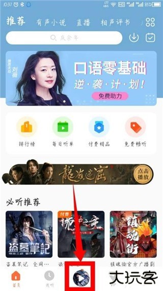 1、打开酷我畅听,在底部选项中,点击中间打开播放。如图所示