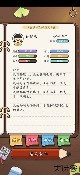 人生模拟器中国式人生是一款高自由度的沉浸式文字模拟手游,游戏中,玩家可以体验从出生到变老的完整人生历程。游戏以中国社会为背景,玩家需要通过点击选择,来推动自己的成长和未来发展,玩家做出的每个选择,都会直接影响到个人的属性和后续的剧情走向。同时健康、情商、智商等属性,还会直接影响玩家的职业发展。快来人生模拟器中国式人生体验不一样的人生吧!