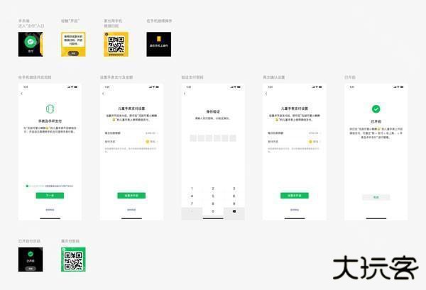 开通:家长可以在侧边栏进入支付入口,使用手机微信扫码为儿童开通付款码,在设置金额和每日扣款限额并验证支付密码后,付款码开启成功,手表展示付款码。