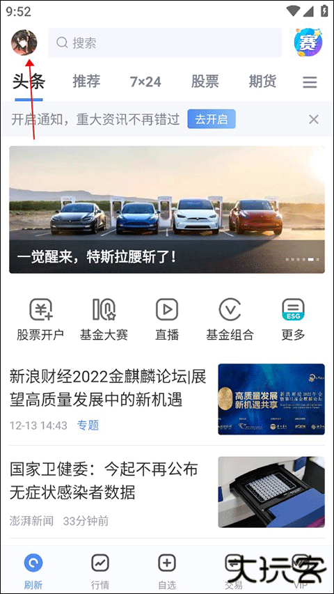 首先我们进入到新浪财经app的主页面,我们可以看见许多资讯和使用的功能,但这些功能和资讯暂时我们先不留意,我们先点击左上角搜索栏左手边的头像,点击它我们就能进入我们的个人中心。