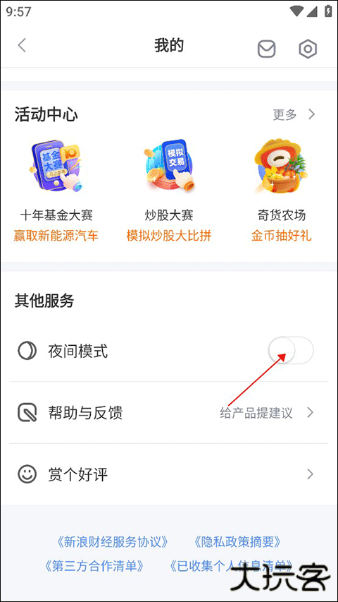 进入个人中心后我们也能看见许多与我们自身有关的功能,这个时候我们往下滑,滑倒底部,我们能够看见在其他服务这个板块有着3个功能:夜间模式、帮助与反馈、赏个好评,这样我们就寻找到了我们需要的夜间模式,我们只需点击一下该功能后面的开关让它变亮就能发现我们的应用背景也随着变暗了,这样说明我们的夜间模式成功开启了,如果后续需要切换的话也只需要点击一下这个开关就能切换成正常模式了,非常方便。
