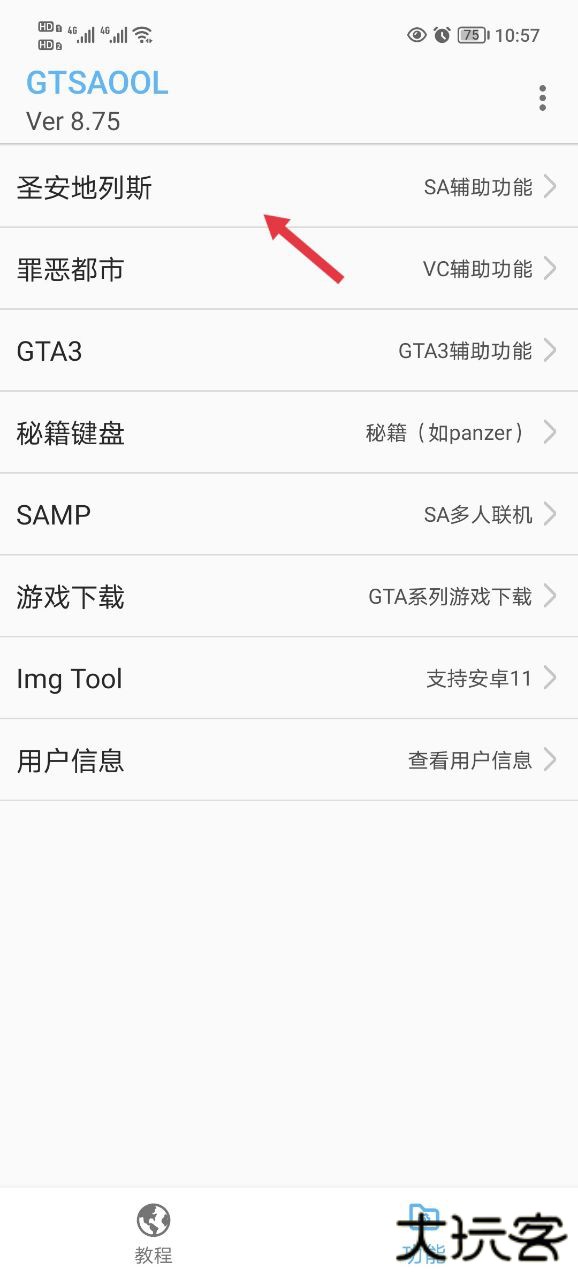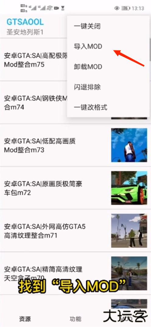 2、实时更新GTASA最新整合包,可在菜单(左上角三个点)处一键下载,使用整合包容易导致游戏闪退,闪退可试试菜单处一键关闭或闪退排除。