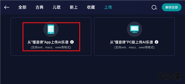 点击从“懂音律”app上传AI乐谱,这个就需要去专门下载这个乐谱app,上面有大量的乐谱,可以从上面下载后上传到此款软件