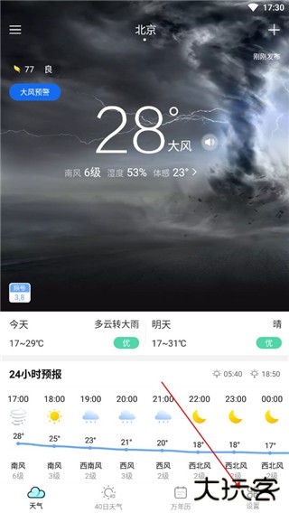 轻松查阅24小时内天气变化,日出日落,提早预防早晚温差过大;