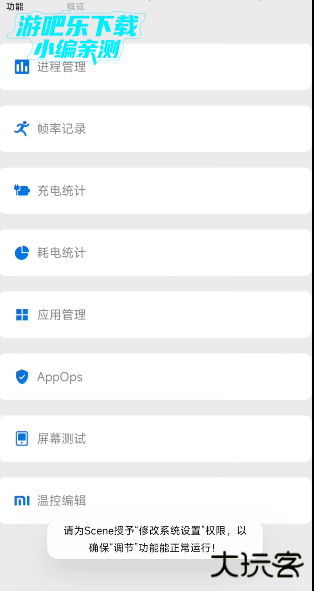 在功能模块中,用户可以进行帧率记录,充电统计,耗电统计,应用管理,活动/服务,温控编辑以及屏幕测试;