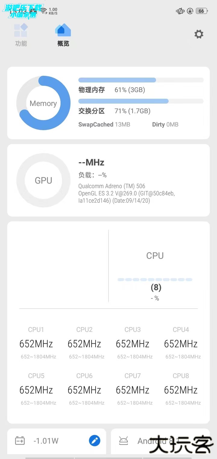 而在概览模块中,用户可以查看手机的物理内存,CPU运行,手机电量、温度、型号以及开机多长时间等信息。