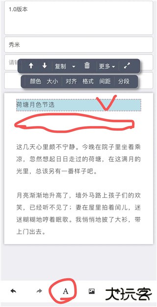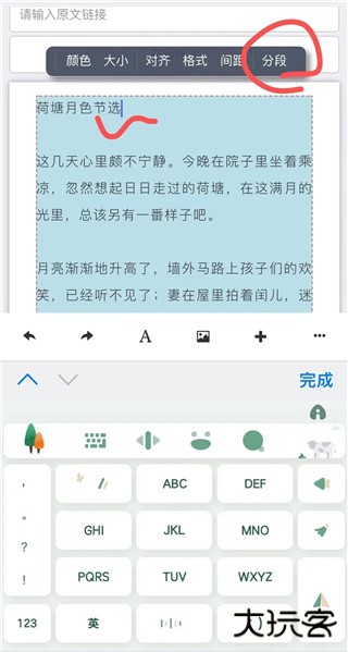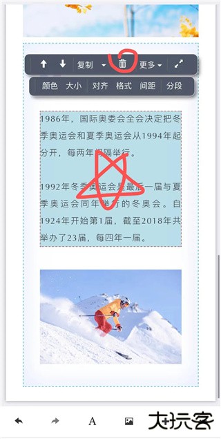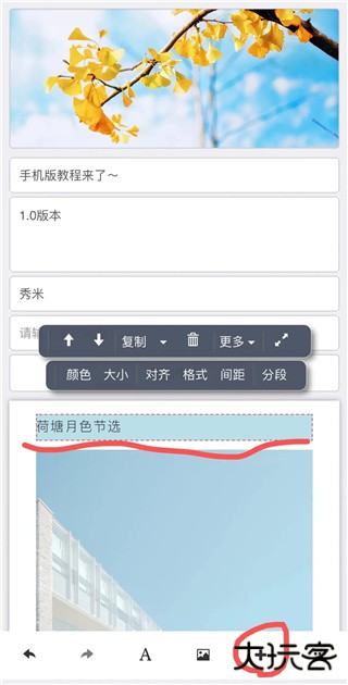 如果想要把一个文字组件里面的内容分成两个文字组件,手指点击定位文字光标,然后再点工具条上的“分段”,一个文字组件就会变成两个文字组件了。