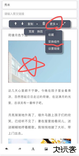 ②先添加文字或图片内容到正文编辑区域,再使用变换组件功能。