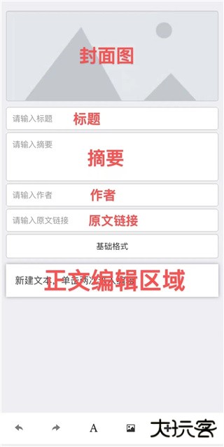 点击“新建图文”之后,会直接进入图文编辑页面,从上往下依次可以设置:封面图、标题、摘要、作者、原文链接、基础格式、正文编辑区域。