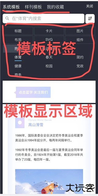 点击编辑页面底部的“+”号可以打开秀米系统模板库以及样刊模板和自己收藏的模板。