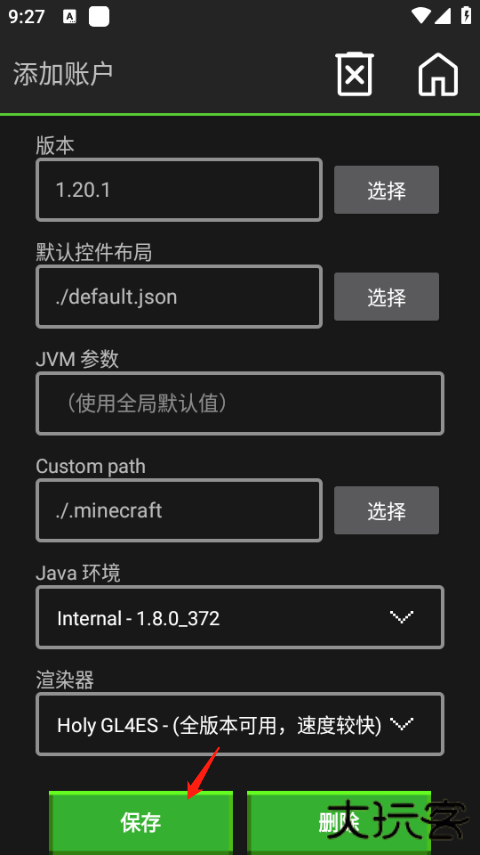 2、添加一个账户,版本选择相对应的就行,渲染器选择全版本可用,速度较快,其它的选项都是默认的,选好之后点击保存。