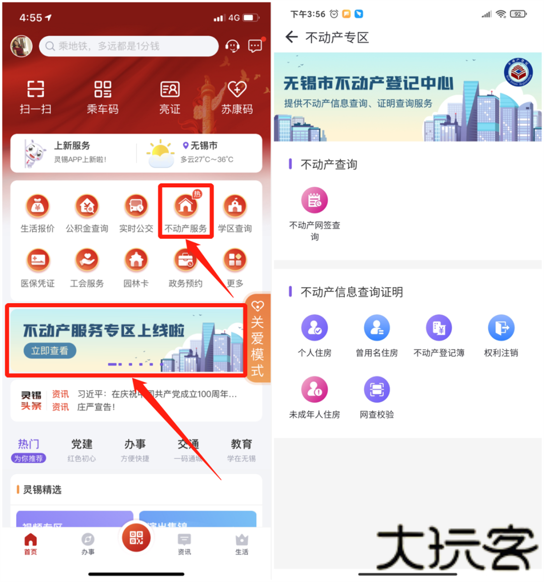 登录“灵锡”APP,点击APP首页—【更多】—【专区服务】—【不动产专区】,或者点击首页不动产服务专区相关海报页进入不动产在线查询版块;