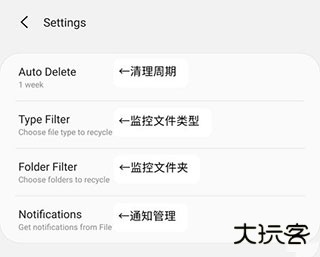 在设置里可以调整文件卫士自身清理周期,监控的文件类型,监控的文件夹,通知栏是否显示通知。