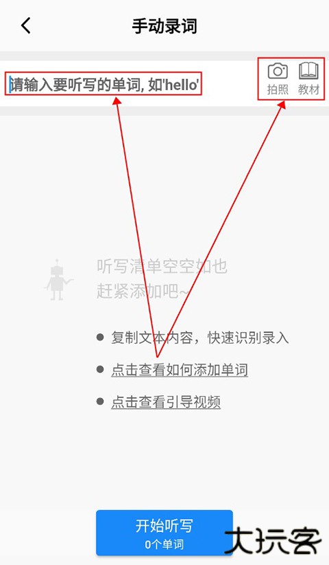之后用户就可以选择搜索、拍照、教材、文本复制,进行单词的录入(小编选择的是教材录入)。