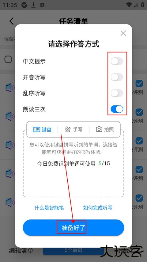 之后用户需要先选择好作答方式,可以选择键盘、手写、拍照三种作答方式,在上方还可以进行中文提示、开卷听写、乱序听写、朗读三次模块的勾选。