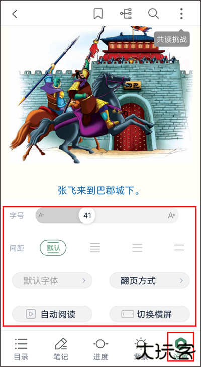 ●正下方横排图标分别为[目录] [笔记][进度] [背景] [设置],点击各按键可进行相应的功能操作。