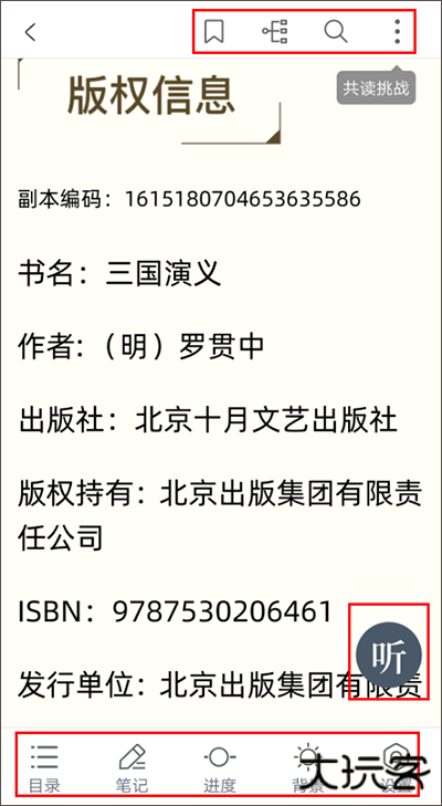 ●在书籍阅读页面,单击屏幕正中间区域,页面上下方都会弹出功能按键。右上方的图标分别为[添加/移除书签] [ 导图] [搜索] […]