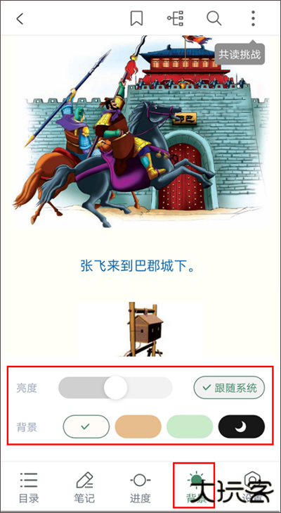 在阅读页点击正中间呼出菜单,点击下方[背景],可对阅读页的背景和亮度进行调整。
