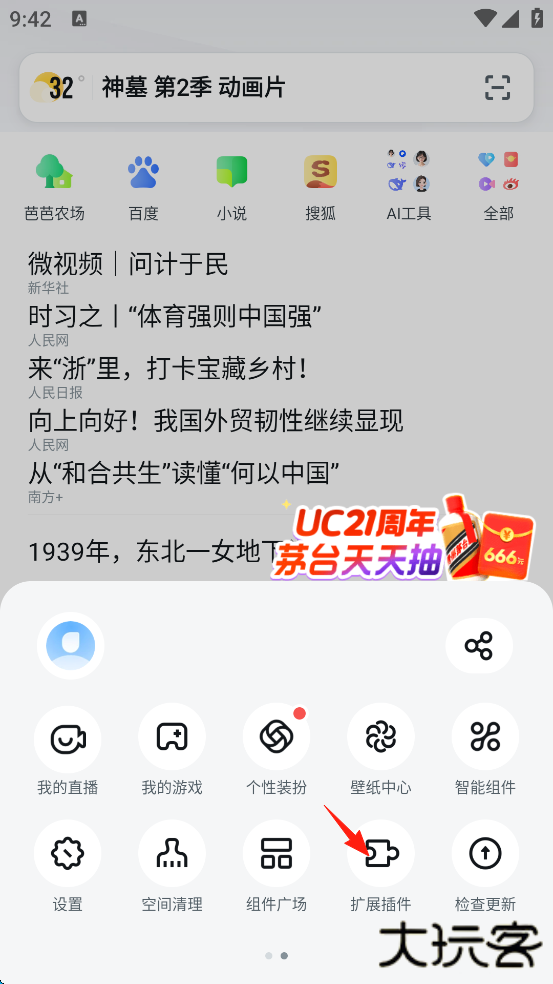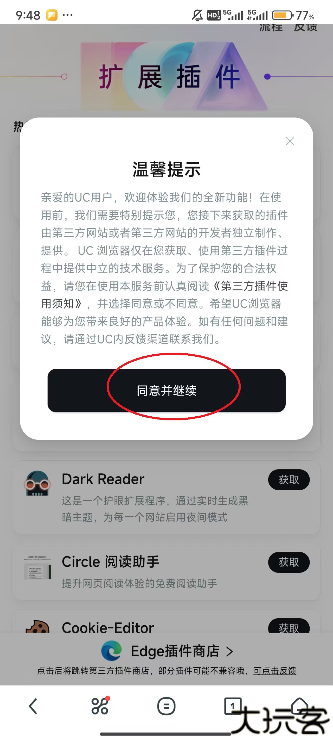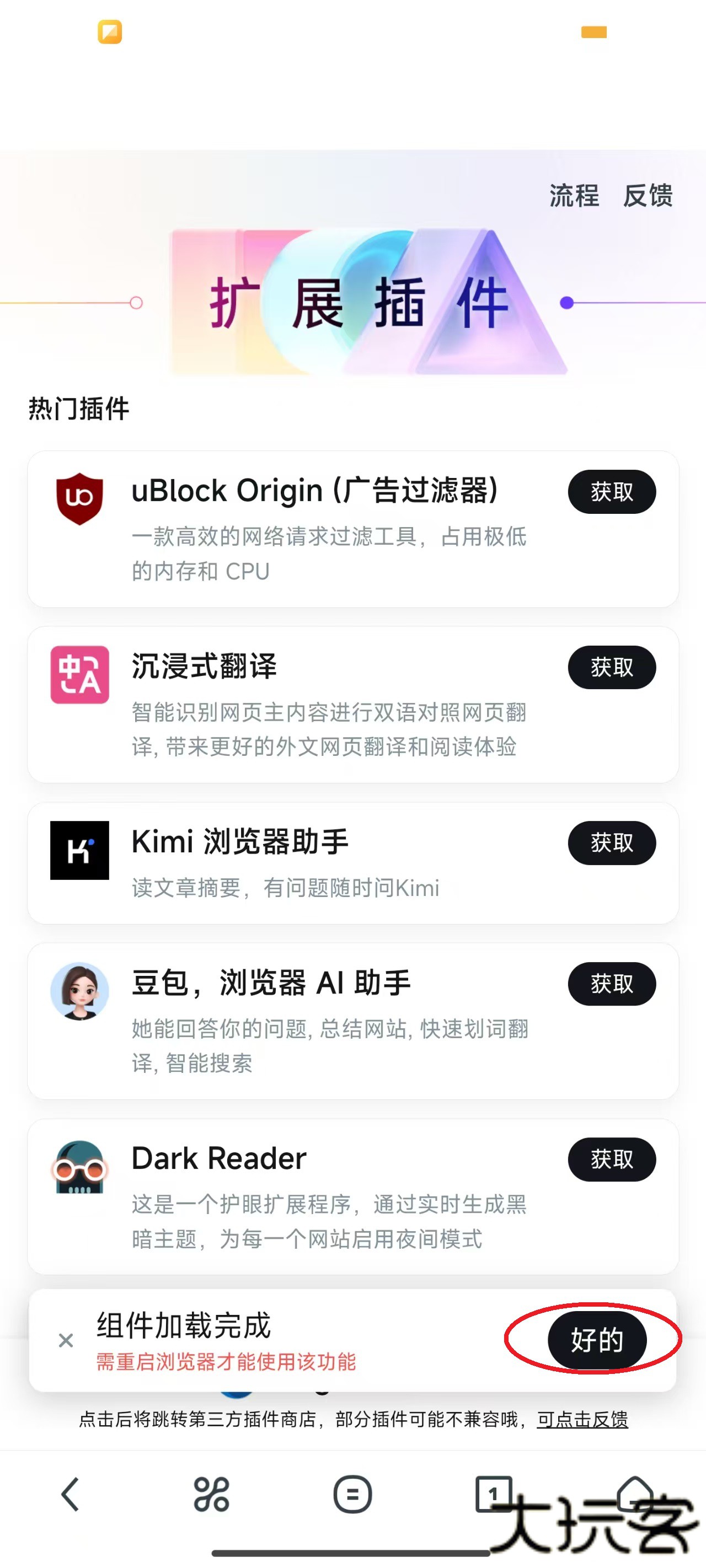 6、当下载完成后,点击右下角处的“好的”,随后重启UC浏览器,回到该页面。