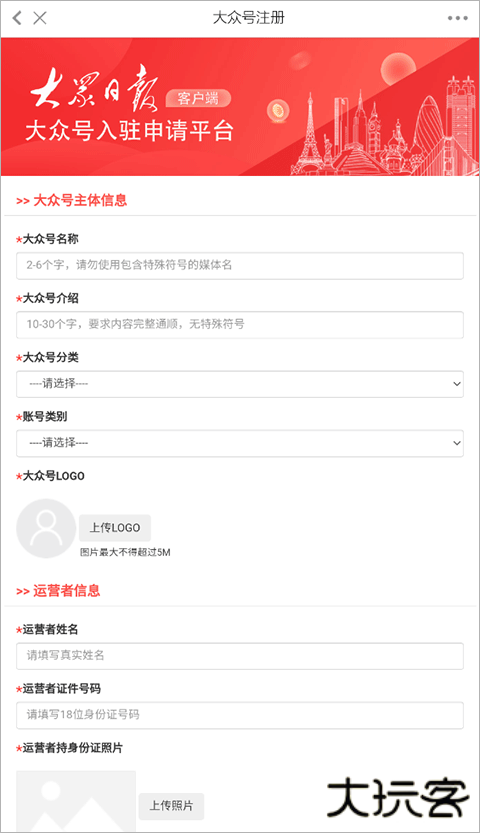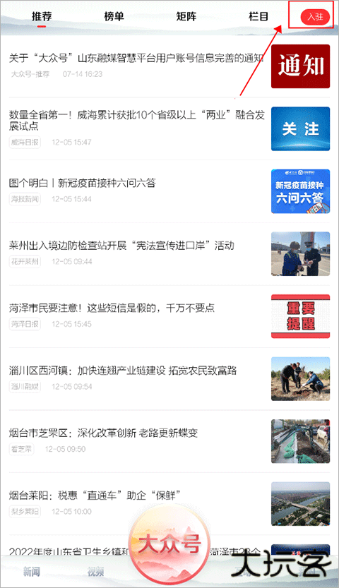 1、打开软件后,点击底部的“大众号”进到页面点击右上角的“入驻”