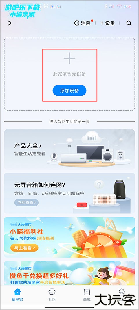 1、打开app,在精灵家页面点击添加设备。