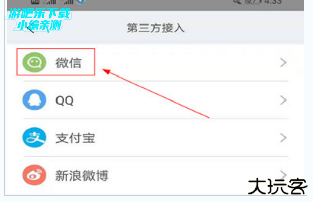 2、在第三方的接入选择中可以看到有微信、QQ、支付宝、新浪微博等选项, 想要绑定微信运动的用户选择“微信”即可。