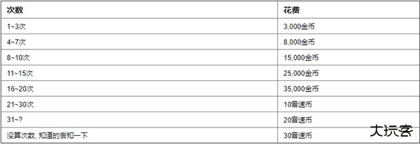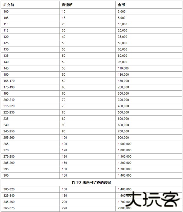 以下为每扩充一次偶像栏位时所需要花费的音速币以及金币