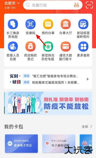 1、首先,在桌面上点击打开皖事通,进入到主页,单击“安康码”;