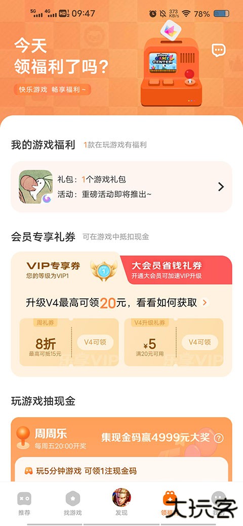 3、在领福利界面,大家可以点击我的游戏福利,领取该游戏的专属福利。