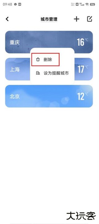 3、长按城市--删除,即可将天气中的城市删除。