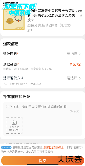 提交申请。点击“提交”,等待商家同意退货后会给退货地址,可自行寄回。如果选择的是上门取件,商家同意退货后将会有快递员在预约的时间内上门取件。