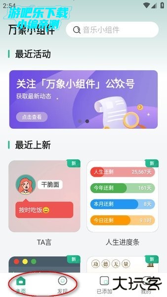 打开万象小组件后,在底部的导航条点击“首页”或“发现”,里面都有很多小组件;