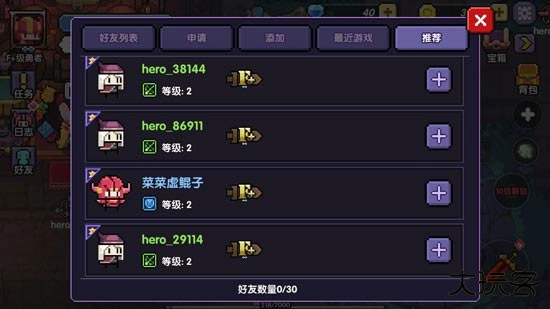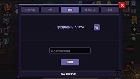 2、在好友系统中,你可以选择【添加】,输入好友的勇者ID或昵称,搜索添加好友,也可以将你的勇者ID复制给好友让对方添加。