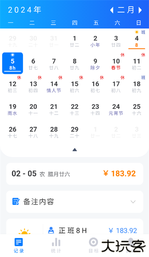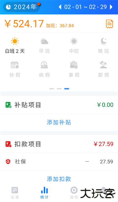 2、每天记录自己的上班日程便会自动将你的正常上班工资和加班工资记录下来。