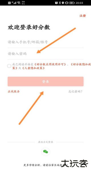 1、打开好分数app,输入手机号与密码,点击登录。
