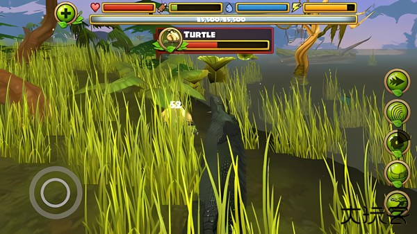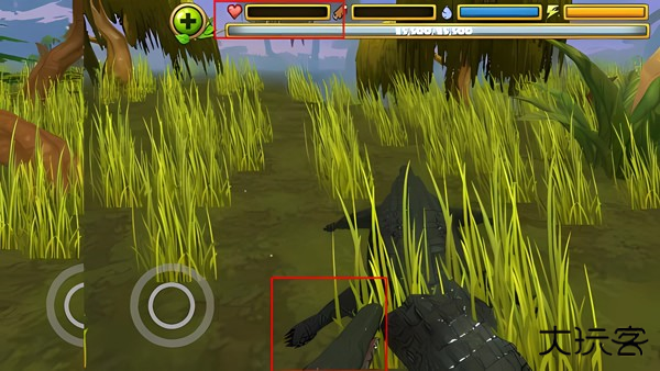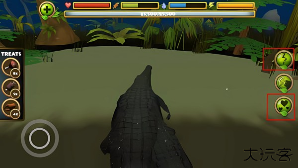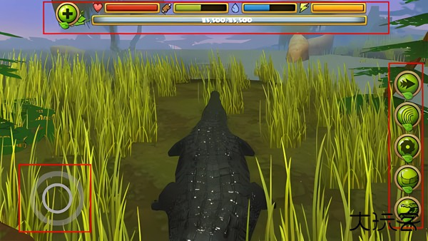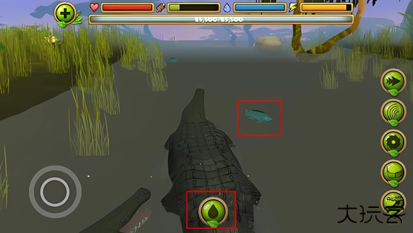 2、鳄鱼一旦进入水中,屏幕上会自动出现捕食按钮,按下它可以猎取食物来恢复能量,但要警惕周围的敌对动物,它们可能随时威胁你的安全。