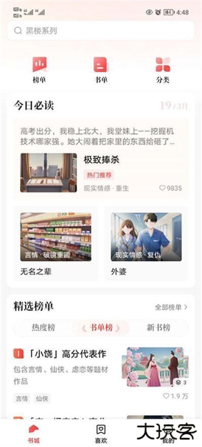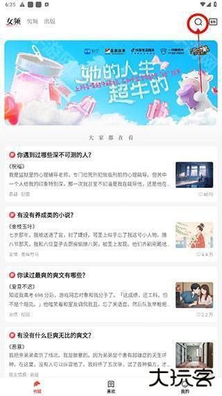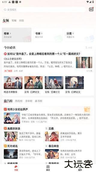 1、下载进入软件就能看到排版简洁清晰的主界面,主题可以选择男频、女频或是已出版的书籍,用户可按自己喜好选择