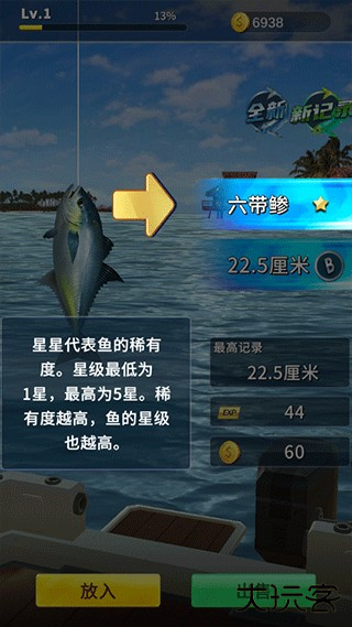 4、成功钓起来的鱼,右侧会显示名称、稀有度、长度等信息;