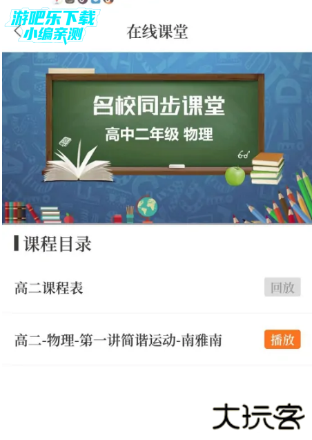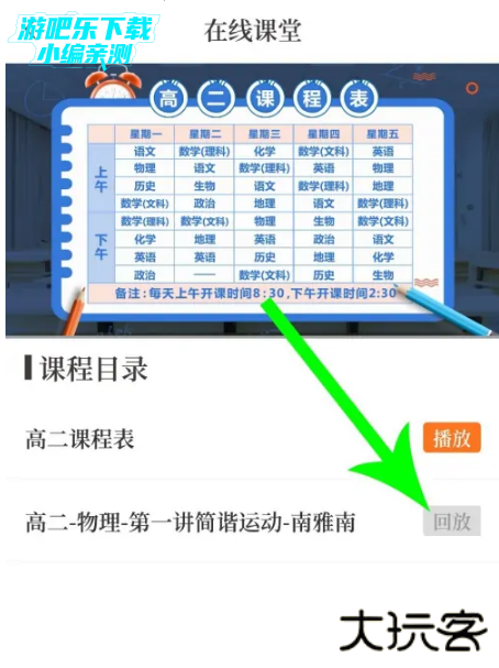 打开“在线课堂-物理”界面,然后点击高二课程表右侧的“回放”按钮即可观看课程表。接着点击课程右侧的“回放”按钮即可观看直播课视频回放。