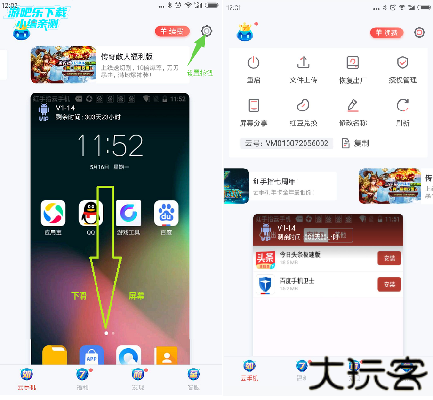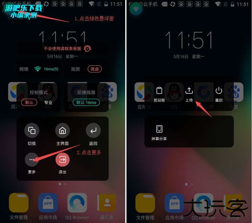1.红手指安卓版云手机游戏/文件上传功能入口呼出: