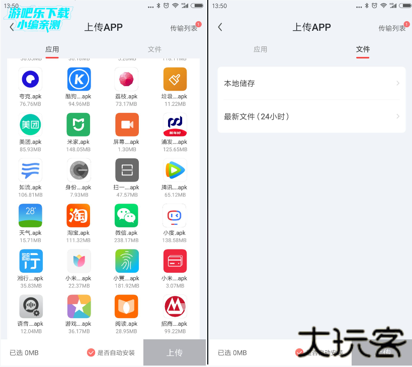 2.进入游戏上传功能界面,红手指云手机会自动检测手机内已有的APK文件并展示,也可以选择上传其他格式的文件。点击需要上传的文件,并勾选是否自动安装文件,点击“上传”按钮。