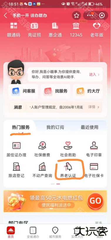 1、点击进入赣服通平台,在热门服务内容中滑至“养老认证”;