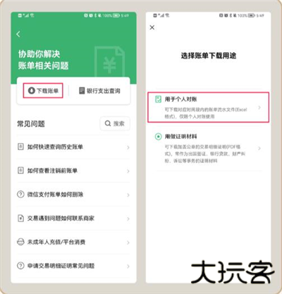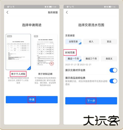 2、选择用于个人对账,点击申请后,选择你要导出账单的时间范围,点击下一步。