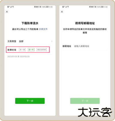 4、选出要导出账单的时间范围后,点击下一步,填写账单的接收邮箱,然后点击下一步。