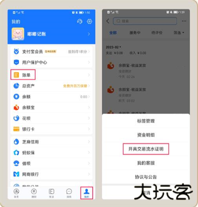 1、打开支付宝app,依次点击我的、账单,然后点击右上角三个点,选择开具交易流水证明。