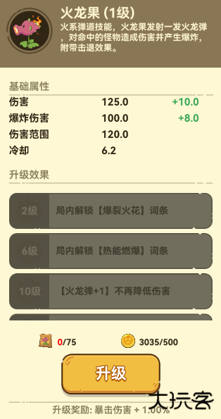 火系弹道技能,火龙果发射一发火龙弹对命中的怪物造成伤害并产生爆炸,附带击退效果。