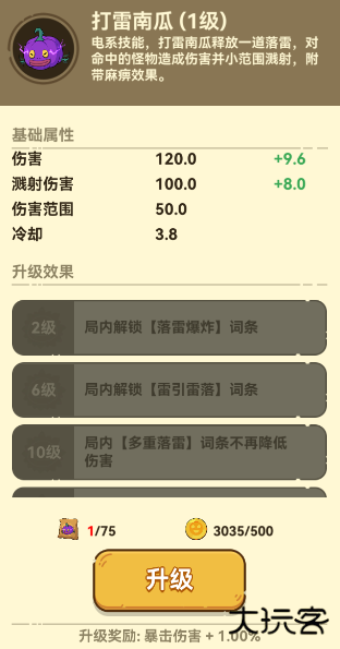 电系技能,打雷南瓜释放一道落雷,对命中的怪物造成伤害并小范围溅射,附带麻痹效果。