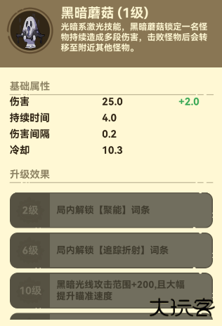 光暗系激光技能,黑暗蘑菇锁定一名怪物持续造成多段伤害,击败怪物后会转移至附近其他怪物。