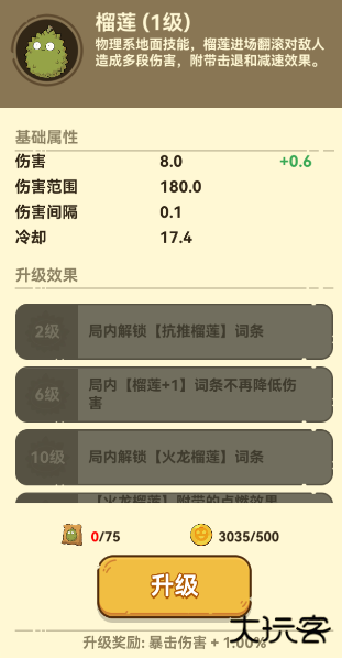 物理系地面技能,榴莲进场翻滚对敌人造成多段伤害,附带击退和减速效果。